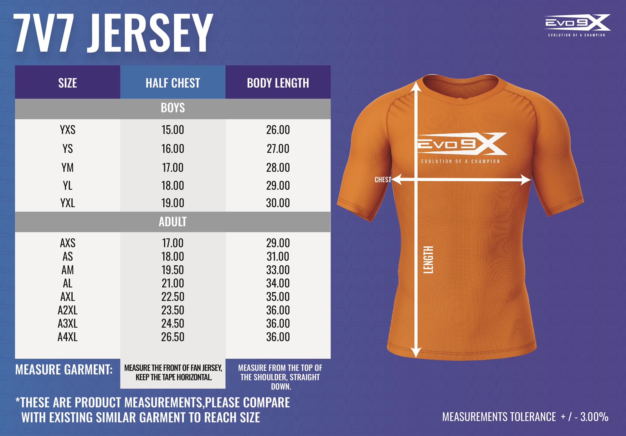 Football 7 v 7 Jersey Size Chart